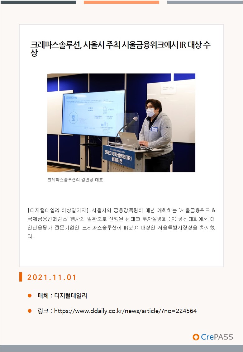 크레파스솔루션, 서울시 주최 서울금융위크에서 IR 대상 수상