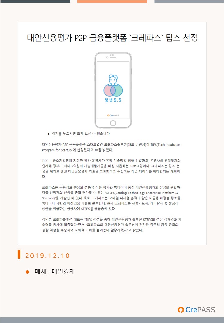 대안신용평가 P2P 금융플랫폼 '크레파스'팁스 선정
