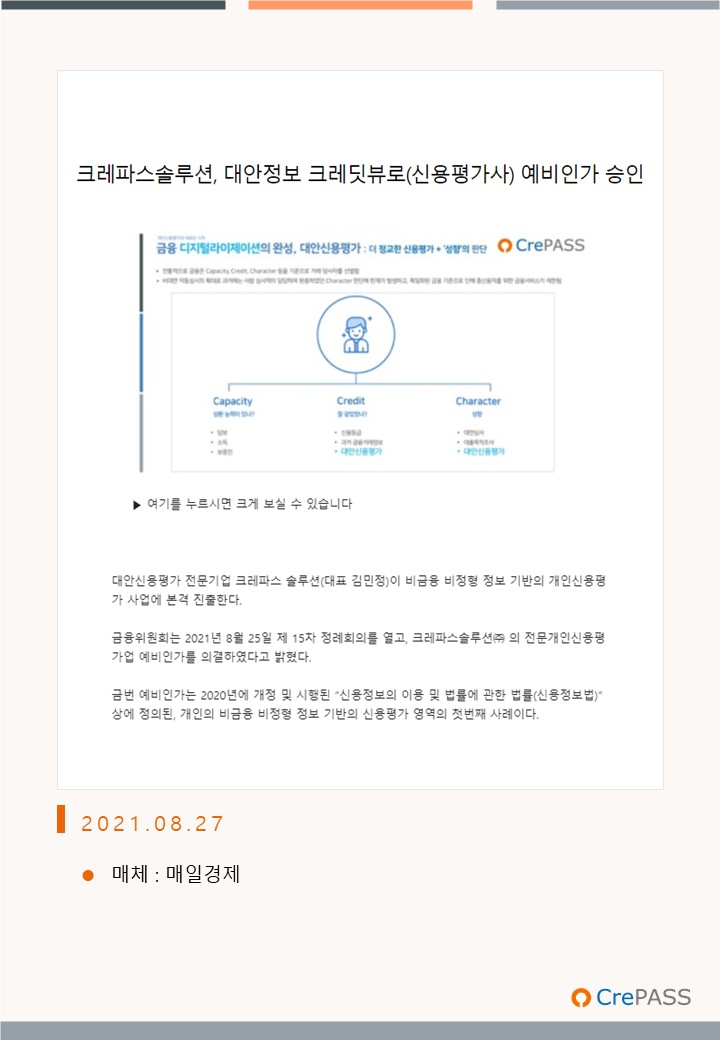 크레파스솔루션, 대안정보 크레딧뷰로(신용평가사) 예비인가 승인