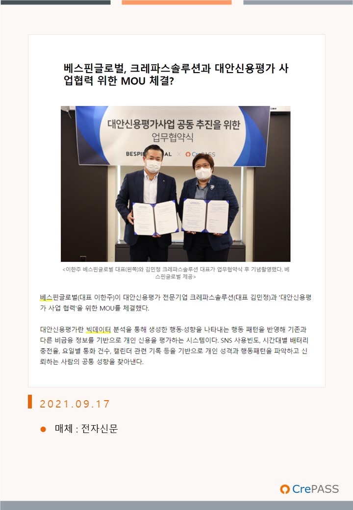 베스핀글로벌, 크레파스솔루션과 대안신용평가 사업협력 위한 MOU 체결