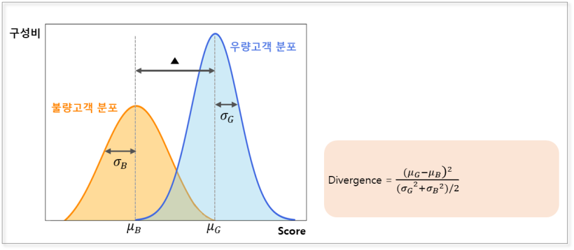 발산(Divergence )값은 불량고객 분포와 우량고객 분포가 얼마나 떨어져 있는지를