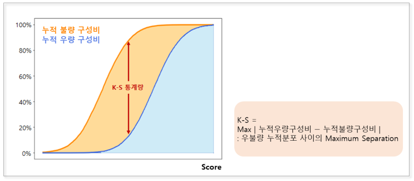 K-S 통계량은 신용평점별로 누적 우량 구성비와 누적 불량 구성비를 산출한 후, 그 차이의