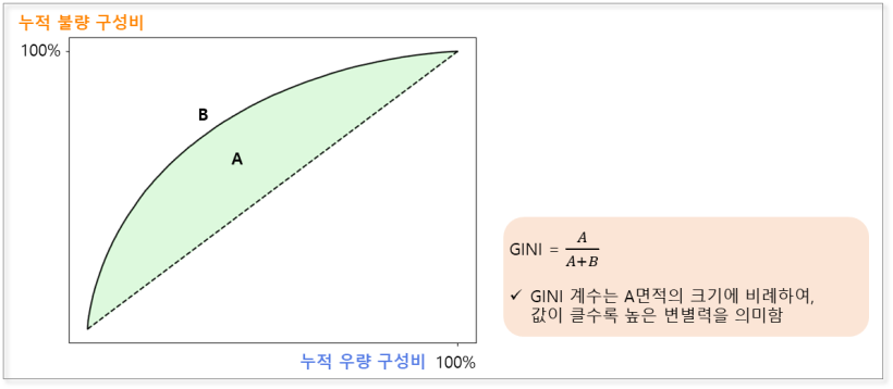 지니(GINI) 계수는 누적우량 구성비를 x축으로, 누적불량 구성비를 y축으로 나타낸 그래프와 Random Curve 사이의 면적의 합에 비례하며, 면적이 넓을수록