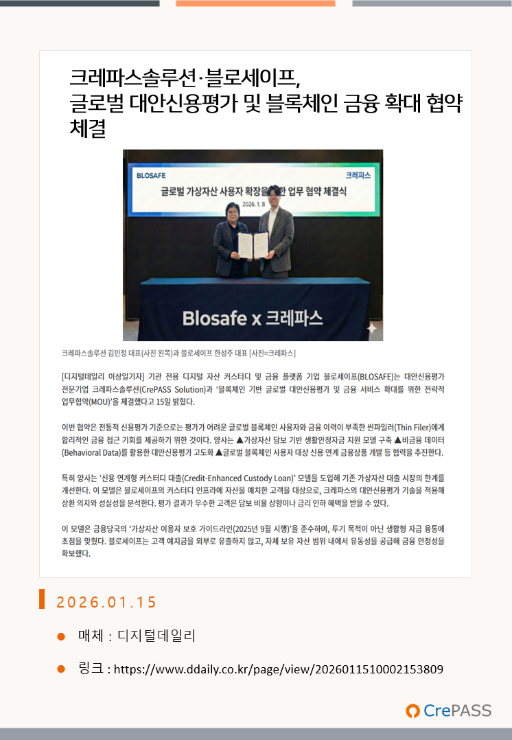 크레파스솔루션·블로세이프, 글로벌 대안신용평가 및 블록체인 금융 확대 협약 체결