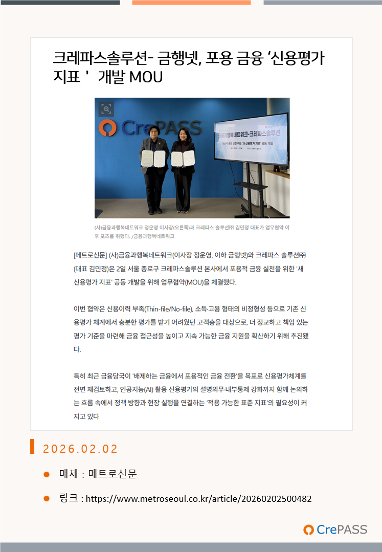 금행넷-크레파스솔루션, 포용 금융 '신용평가 지표' 개발