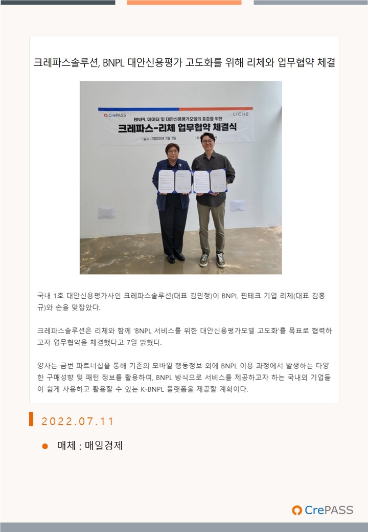 크레파스솔루션, BNPL 대안신용평가 고도화를 위해 리체와 업무협약 체결