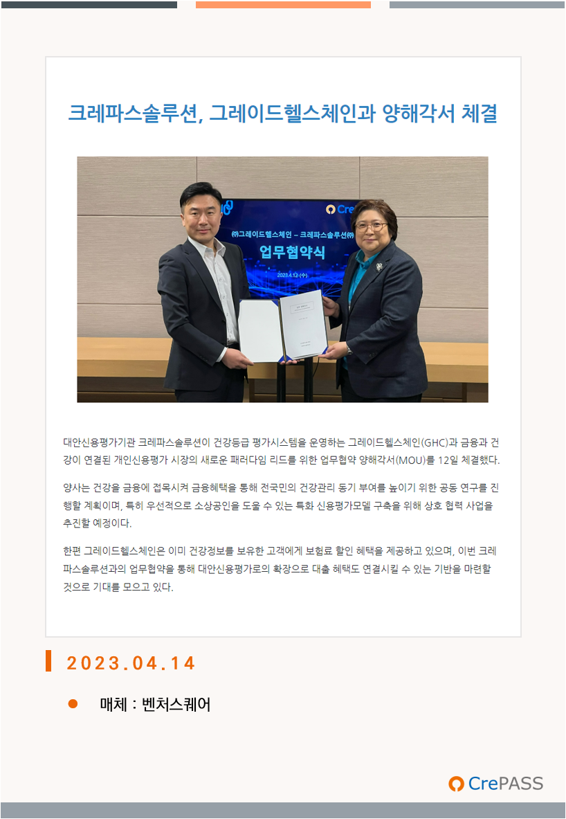 크레파스솔루션, 그레이드헬스체인과 양해각서 체결