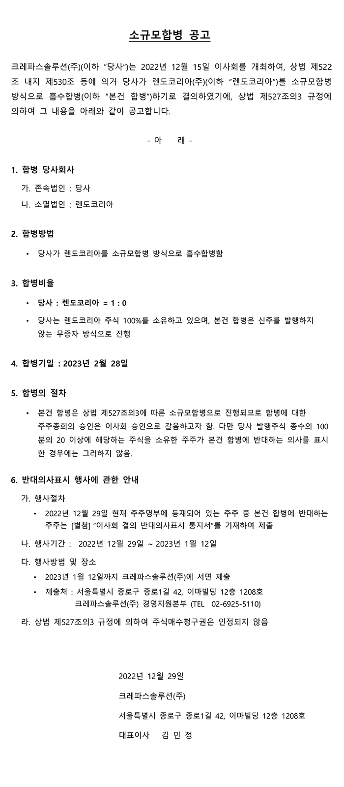 [크레파스솔루션] 소규모합병 공고_20221229_첨부.DOCX