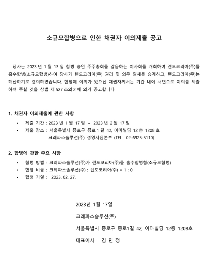 소규모합병으로 인한 채권자 이의제출 공고.docx