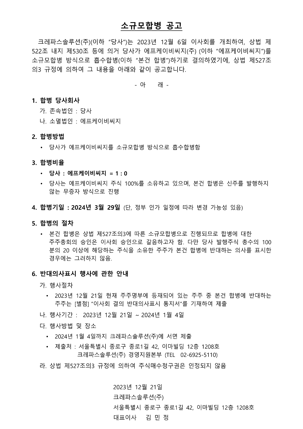 [크레파스솔루션]_소규모합병_공고_20231221_첨부.DOCX