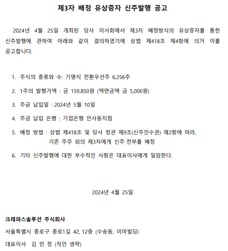 제3자 배정 유상증자 신주발행 공고